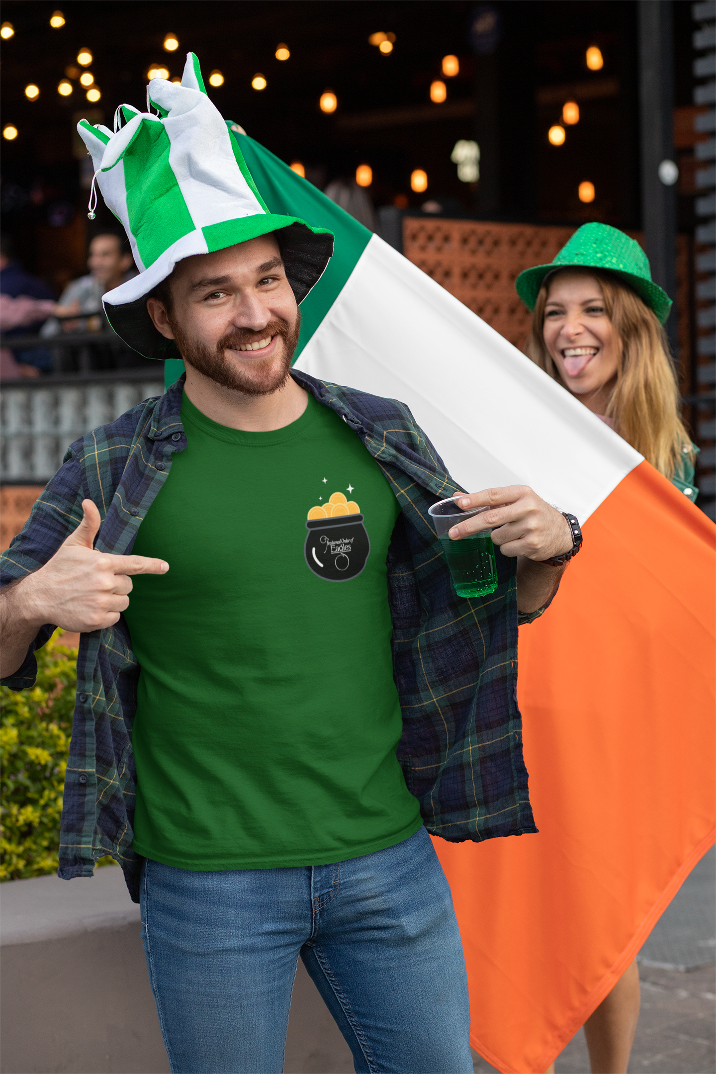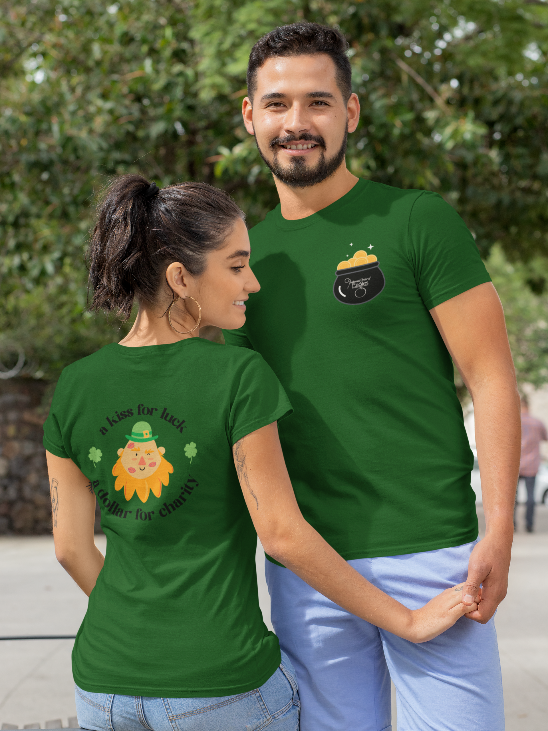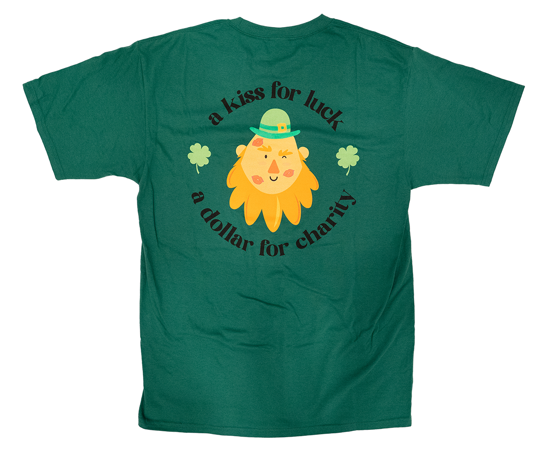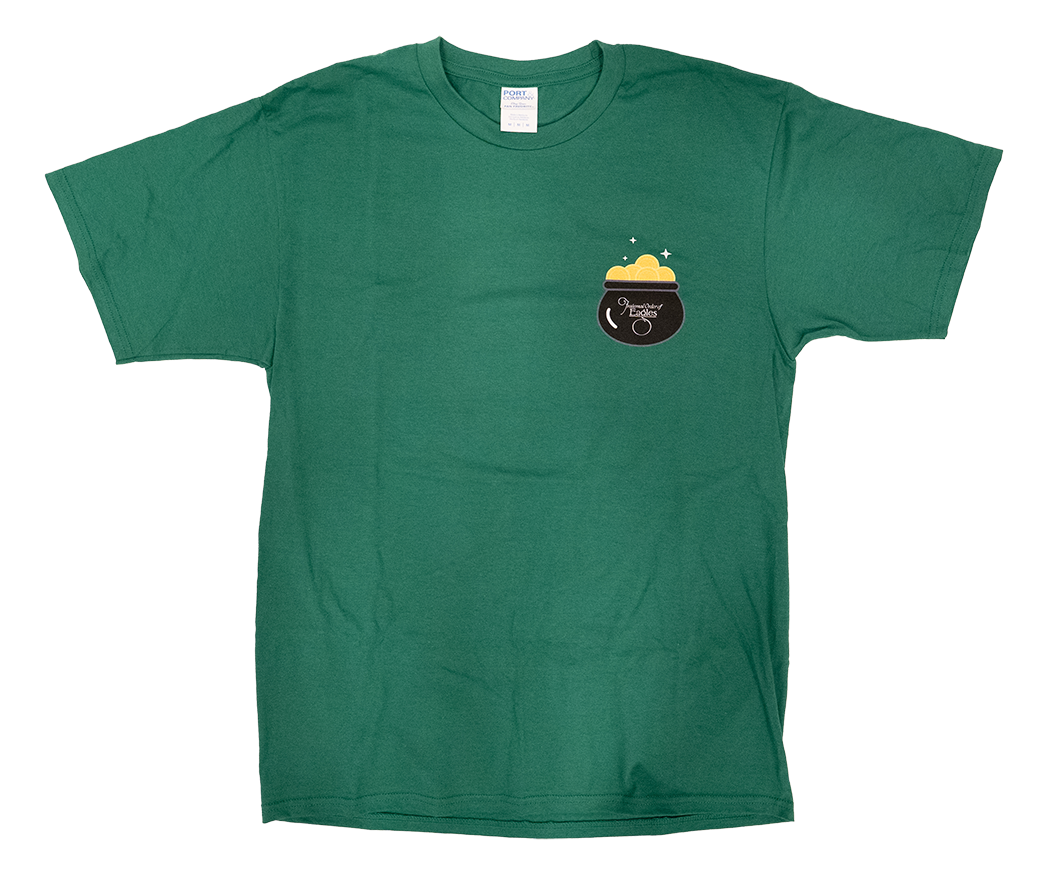 Front of shirt shows the FOE pot of gold. Back of shirt shows the leprechaun and the winning slogan from this year's contest, which was submitted by Tammy Gilbert!