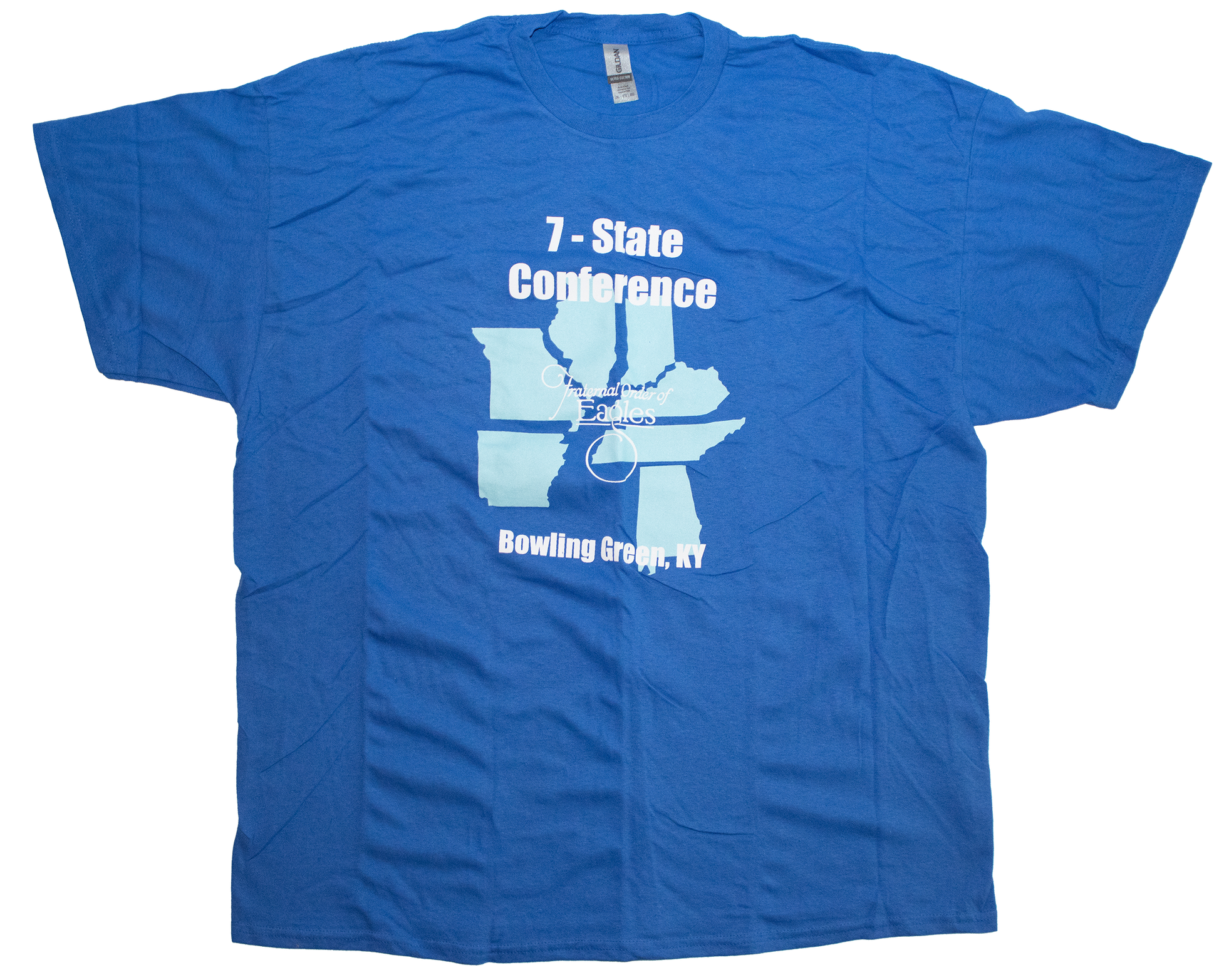 Embrace the spirit of camaraderie with this striking blue shirt which commemorates the annual 7-State Conference in Bowling Green, Kentucky. Crafted from high-quality Gildan material, this shirt offers both style and comfort for the avid event attendee. The event's official logo is skillfully emblazoned in bold white lettering, making it impossible to overlook.