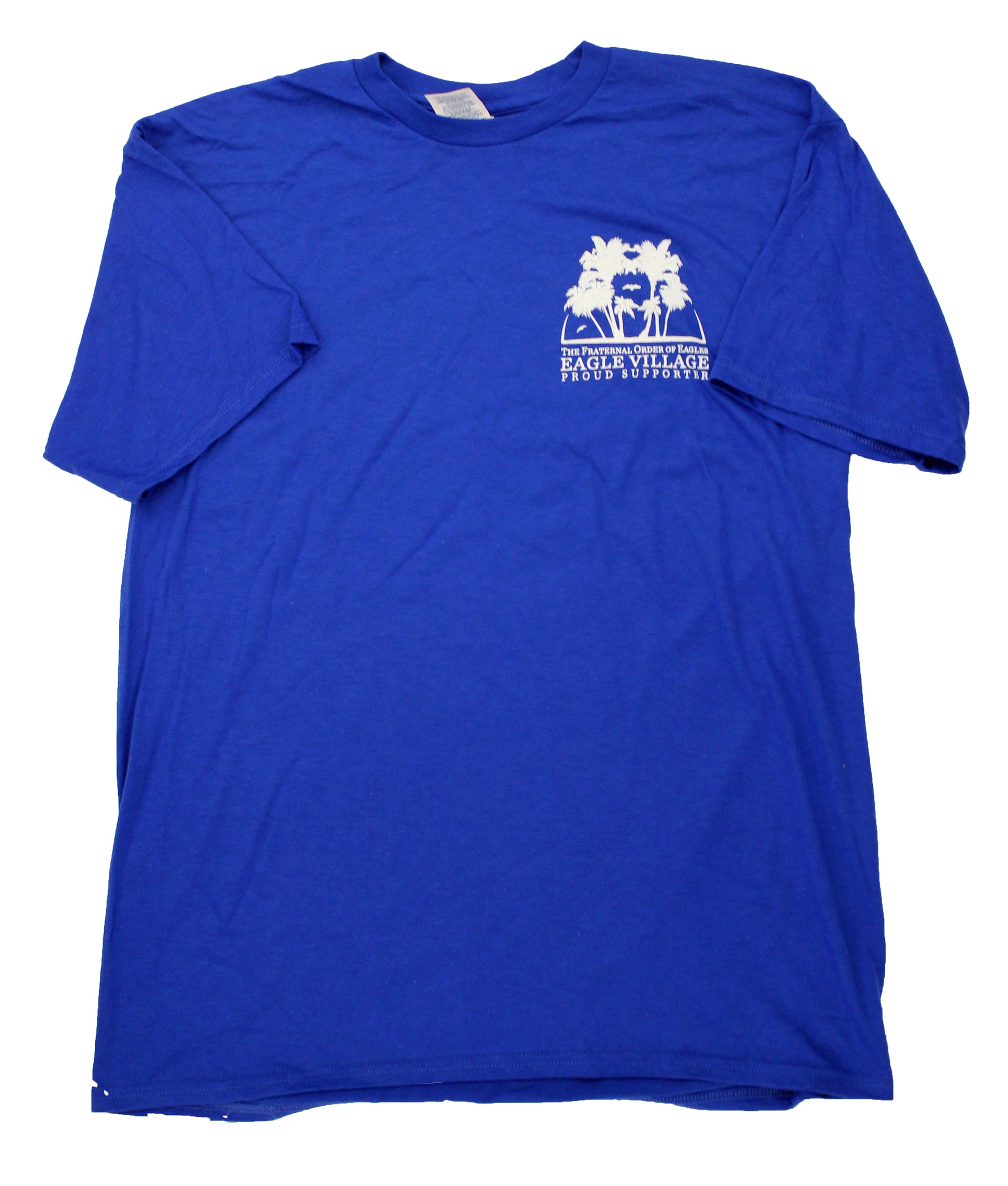 Introducing the Eagle Village Blue T-Shirt, a stylish and comfortable garment. This t-shirt features the iconic Eagle Village logo on both the front and back, proudly representing the esteemed retirement community for FOE members.