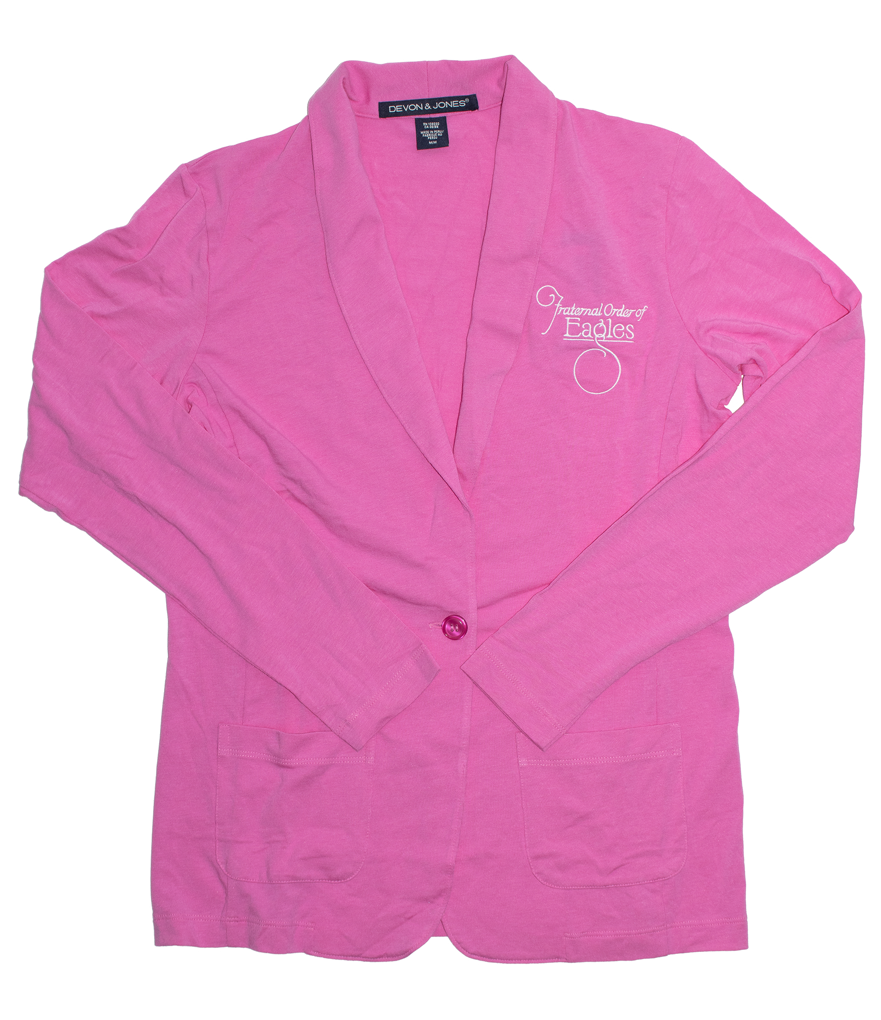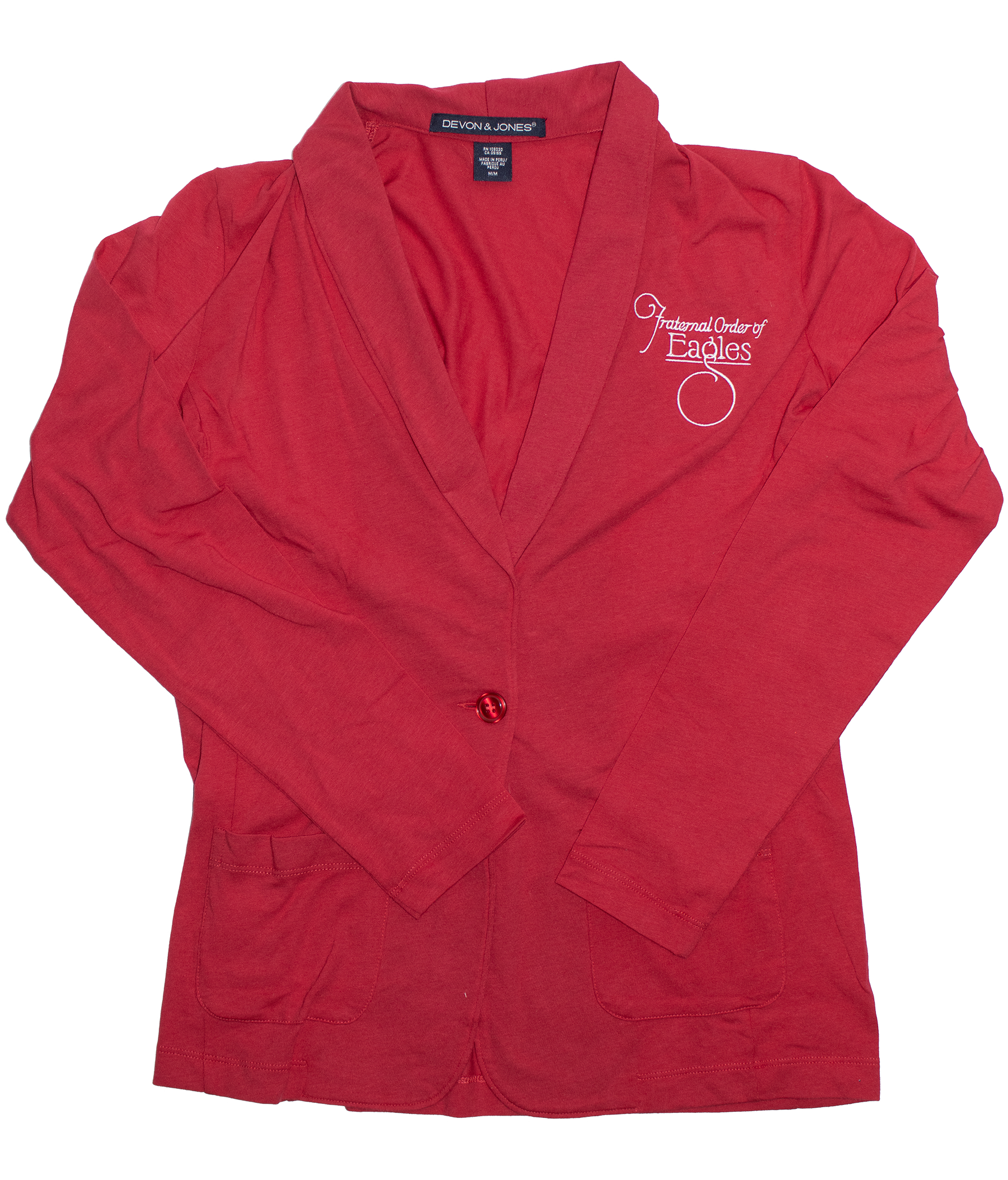 This product description showcases a stylish cardigan adorned with an embroidered logo.