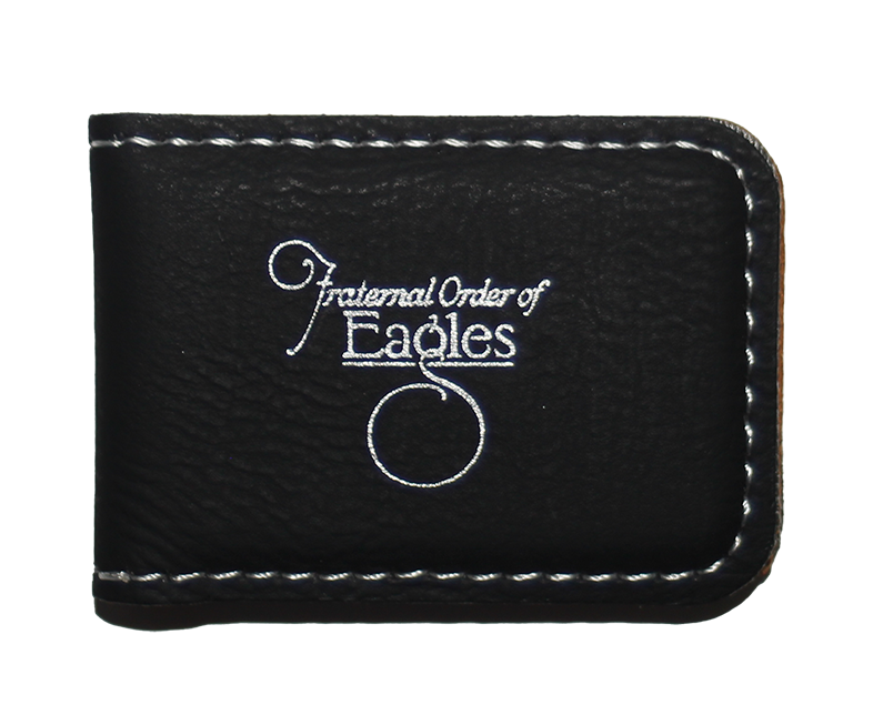 Looking for an easy way to carry your cards and cash? We’ve got you! Having a money clip that proudly displays the "Fraternal Order of Eagles" logo on it, made of leather, serves several practical and symbolic purposes.